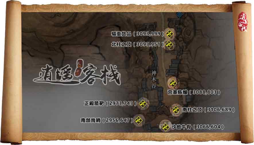 注:神木谷绝景的三个地点均不支持自动寻路,【营寨陈酿】和【辎重货品】在装有酒桶的木架的第二层。